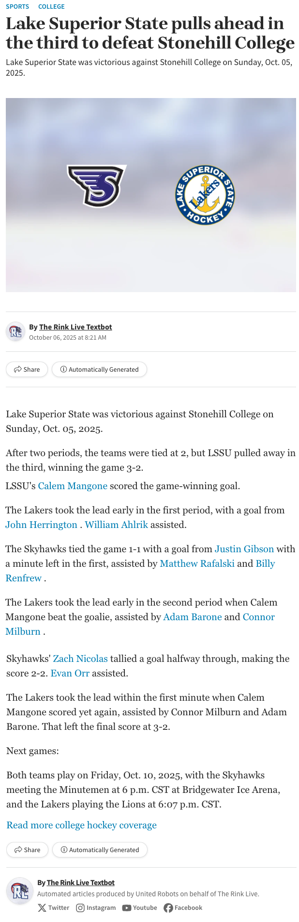 We deliver automated ice hockey content after a game. The texts take into account all types of league specific conditions regarding qualifiers, play-offs, etc. and put the games into context.